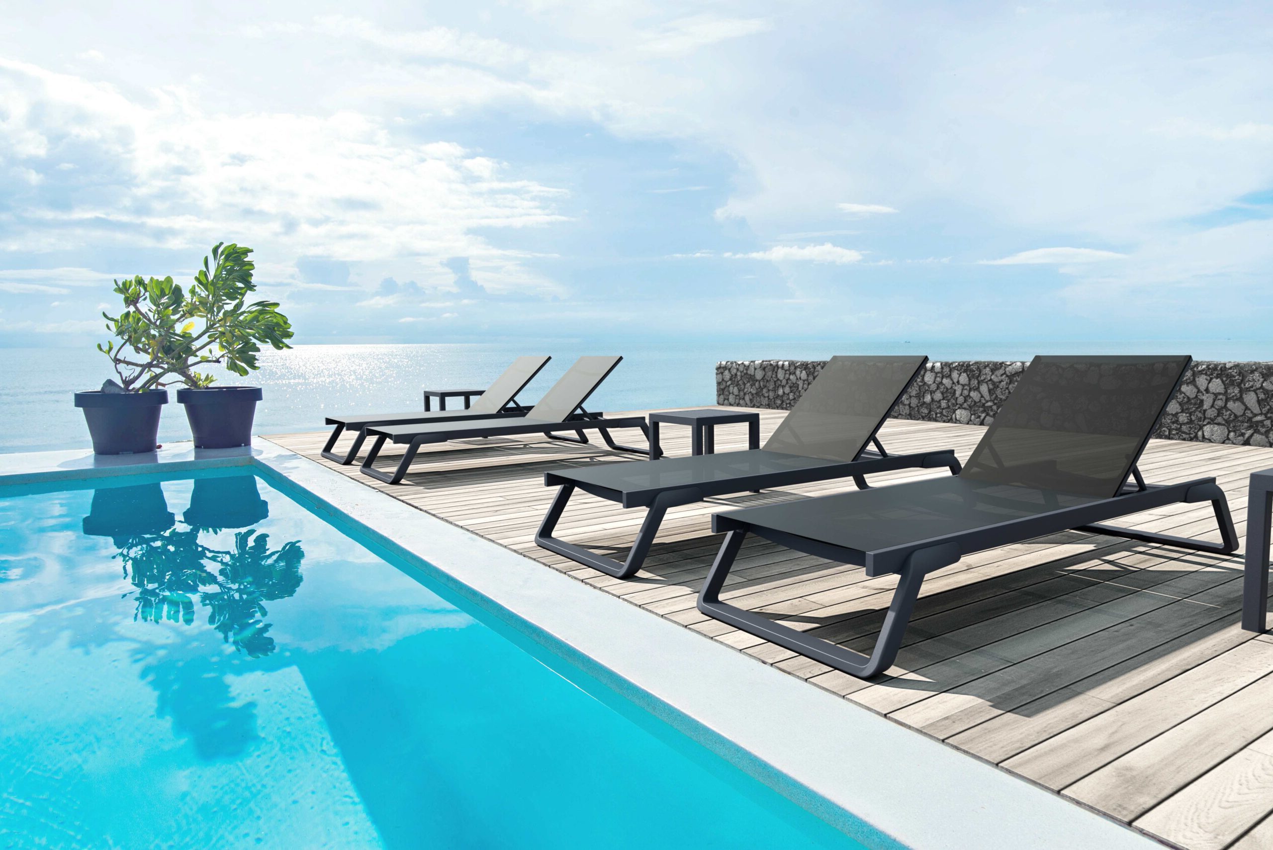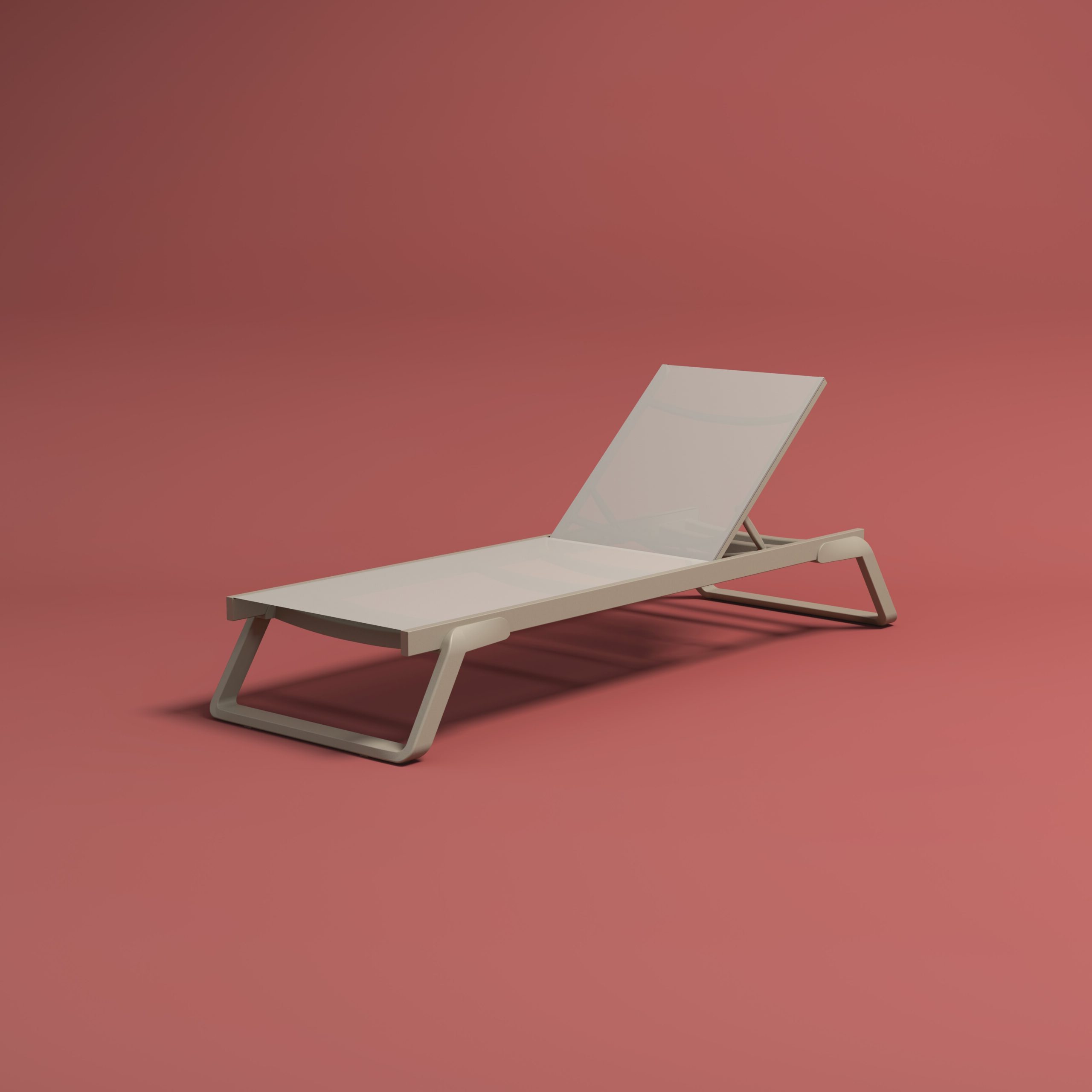 Elegante tumbona apilable con patas de resina reforzada con fibra de vidrio y estructura de aluminio lacado. Su tapizado en tejido sintético transpirable y reemplazable de la prestigiosa marca Serge Ferrari, el cual garantiza exclusividad y solidez. El respaldo es reclinable en 5 posiciones, e incorpora pies antideslizantes y pequeñas ruedas para facilitar su desplazamiento.