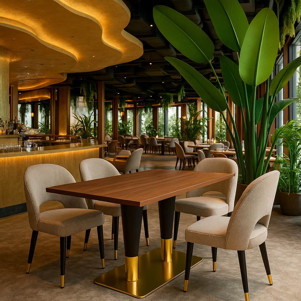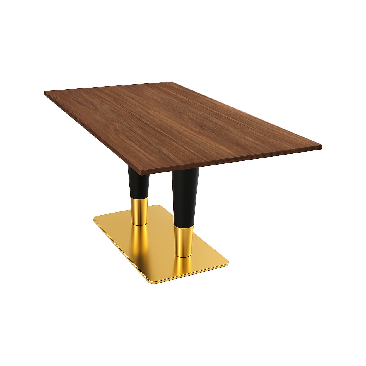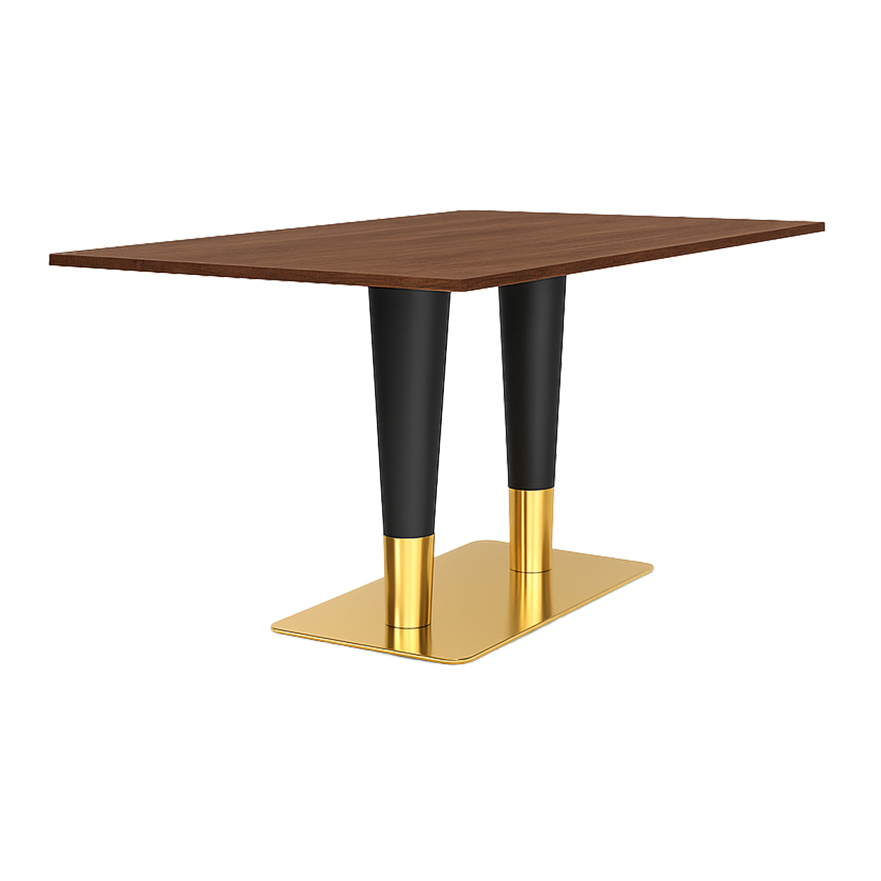 Dos columnas 80x80mm – altura 670mm – oro+negro. AISI 201 acabado oro. Dos soportes de hierro para fijar a tableros 240*240*2 mm. Base rectangular 40x70cm. Altura total 72 cm. Permite tapas de mesa máximo 140×80. USO EN INTERIORES.