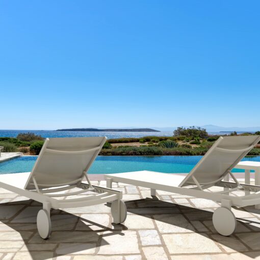 Con pies antideslizantes y ruedas de goma para un desplazamiento suave, esta tumbona une funcionalidad y seguridad. Además, es apilable, lo que optimiza el almacenamiento en hoteles, resorts o residencias con zonas de piscina.