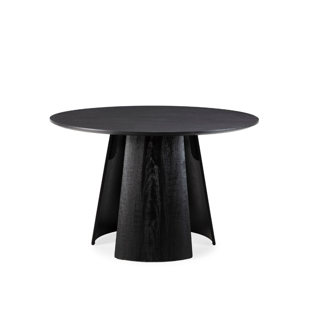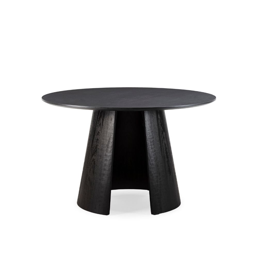 El acabado negro realza la textura de la madera y aporta un toque de sofisticación, mientras que su base cónica —robusta y con carácter escultórico— asegura una excelente estabilidad y aporta un aire moderno y elegante al ambiente.