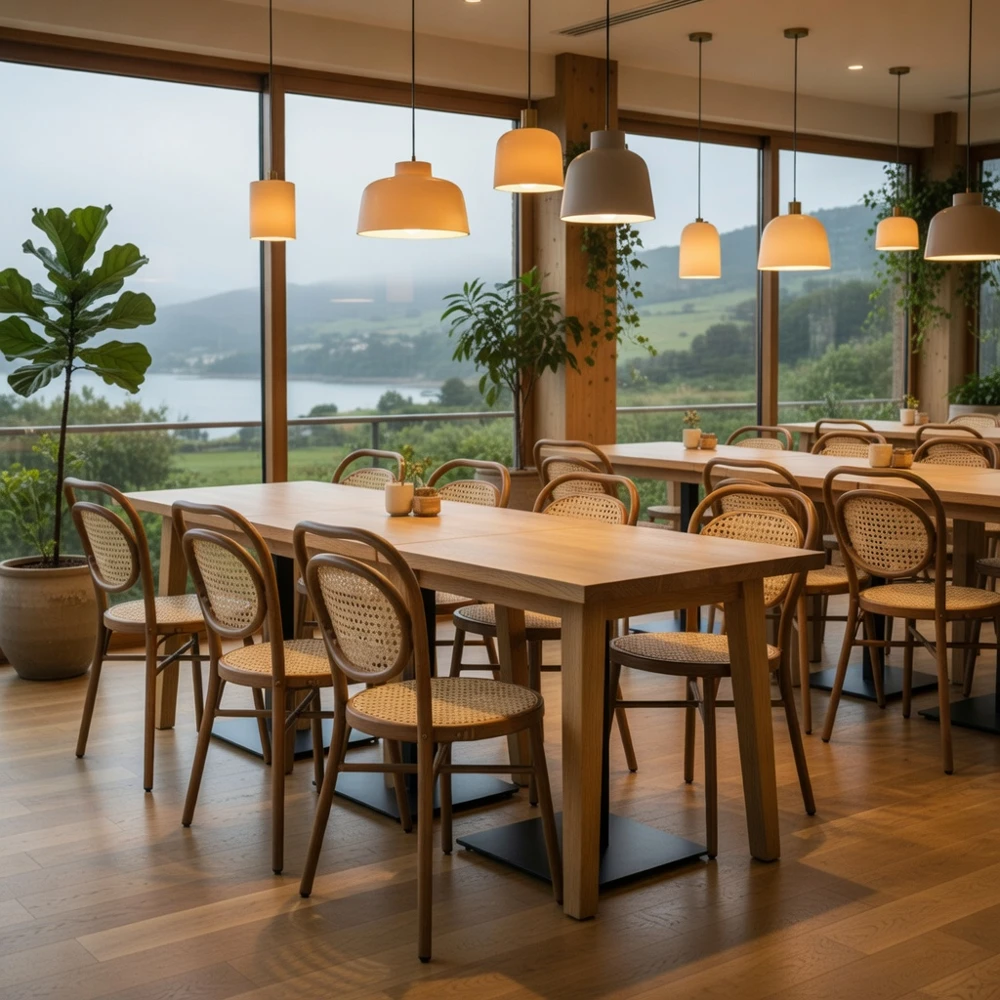 Esta silla combina el encanto del diseño clásico con las prestaciones actuales de materiales técnicos. Su estructura de aluminio, acabada en efecto roble natural o nogal, reproduce la estética de la madera curvada tradicional, aportando calidez sin renunciar a la ligereza y durabilidad necesarias para uso intensivo.