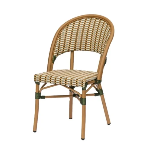 Silla de inspiración bistró que reinterpreta el clásico diseño de las terrazas europeas con una construcción pensada para el uso actual en hostelería y contract. Su estructura está fabricada en aluminio con acabado pintado efecto roble, logrando la apariencia cálida de la madera con las ventajas de un material ligero, resistente y de fácil mantenimiento.