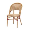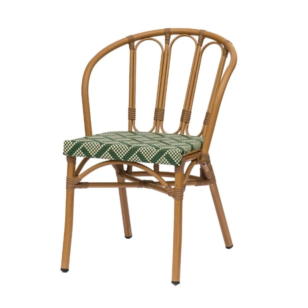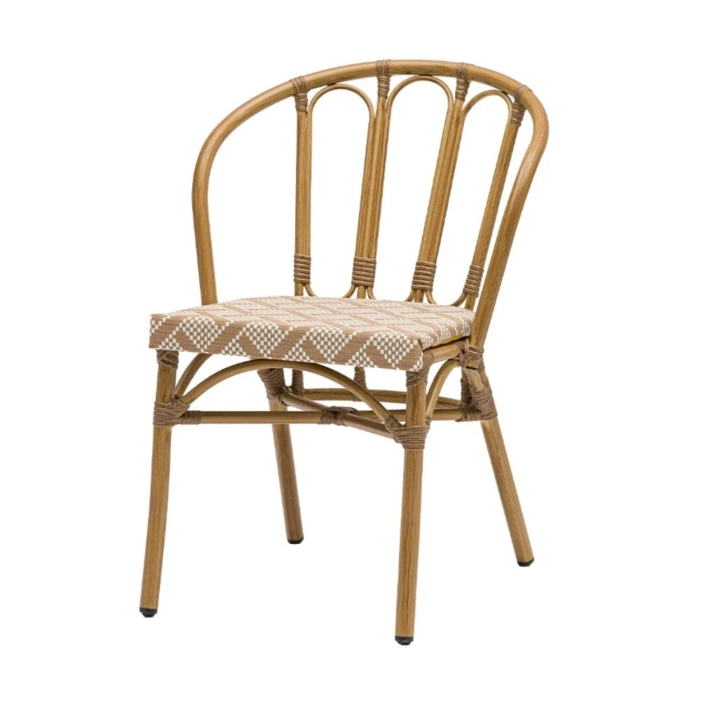 Silla de inspiración bistró que combina estética natural y prestaciones técnicas, ideal para proyectos de hostelería y espacios exteriores. Su estructura está fabricada en aluminio con acabado pintado efecto roble natural, aportando la calidez visual de la madera con la resistencia y ligereza del aluminio (sin preocupaciones por el paso del tiempo o la intemperie).