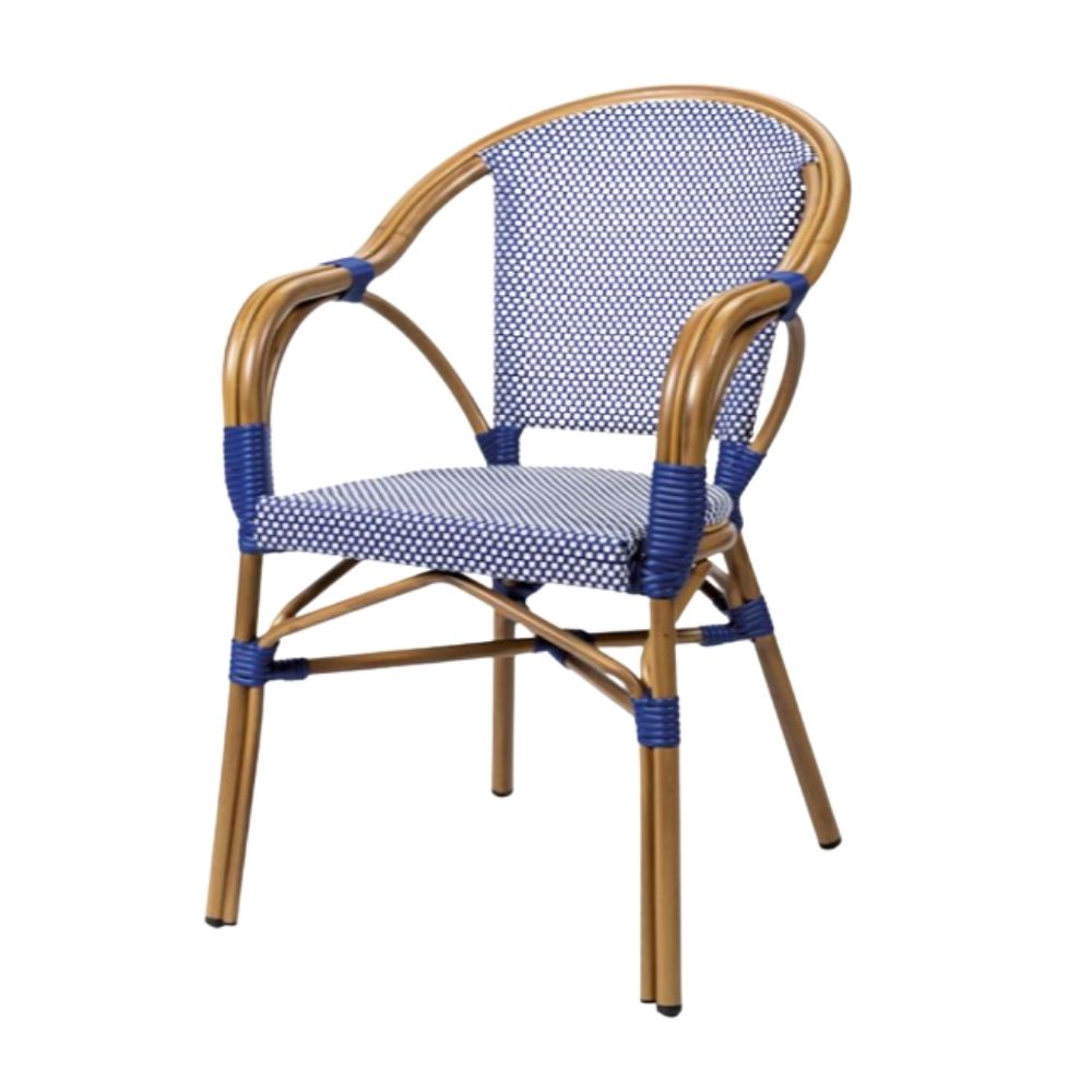 Armazón de aluminio pintado deco bambu con asiento y respaldo textilene duo en diferentes versiones de colores. Peso: 3,85kg. 57x60x86h cm. Altura de brazo a suelo: 65cm