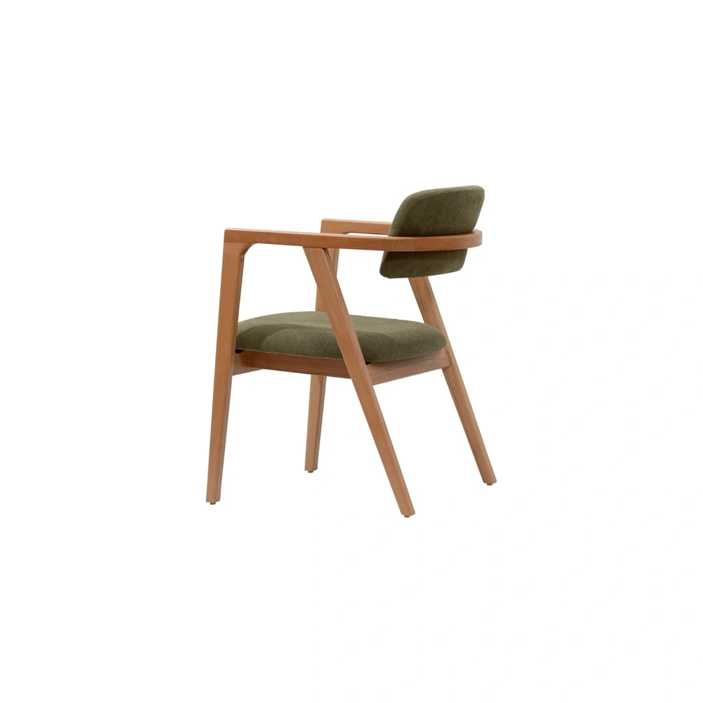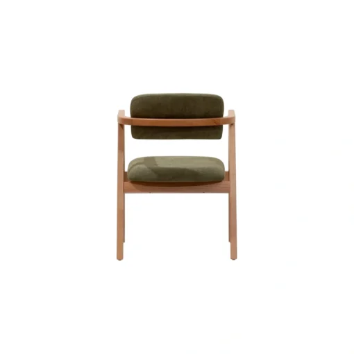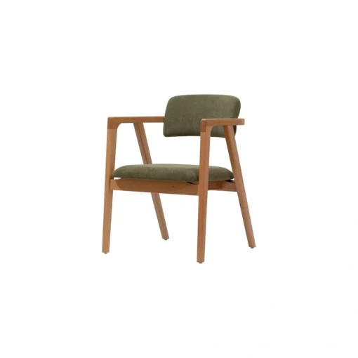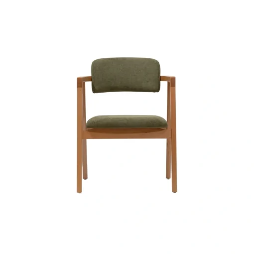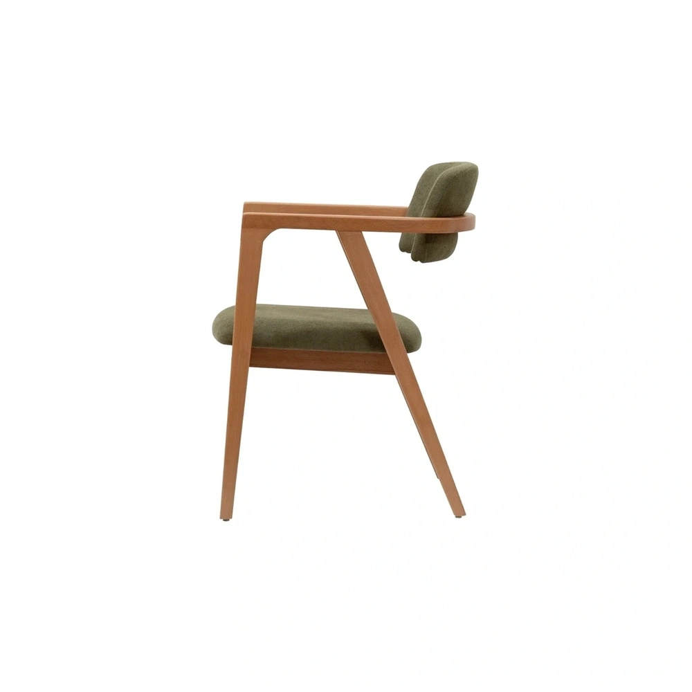 Silla con brazos tapizada en verde oliva es una de las piezas más cotizadas para proyectos Horeca en 2026. Su diseño curvo envolvente, brazos integrados y combinación de madera natural con tapizado en tono oliva/musgo crean una atmósfera de calma sofisticada y conexión orgánica, perfecta para espacios que buscan confort premium y personalidad sutil sin recargar el ambiente.