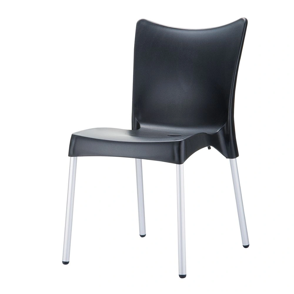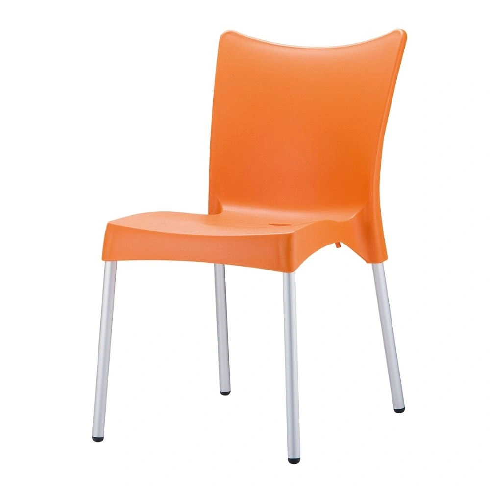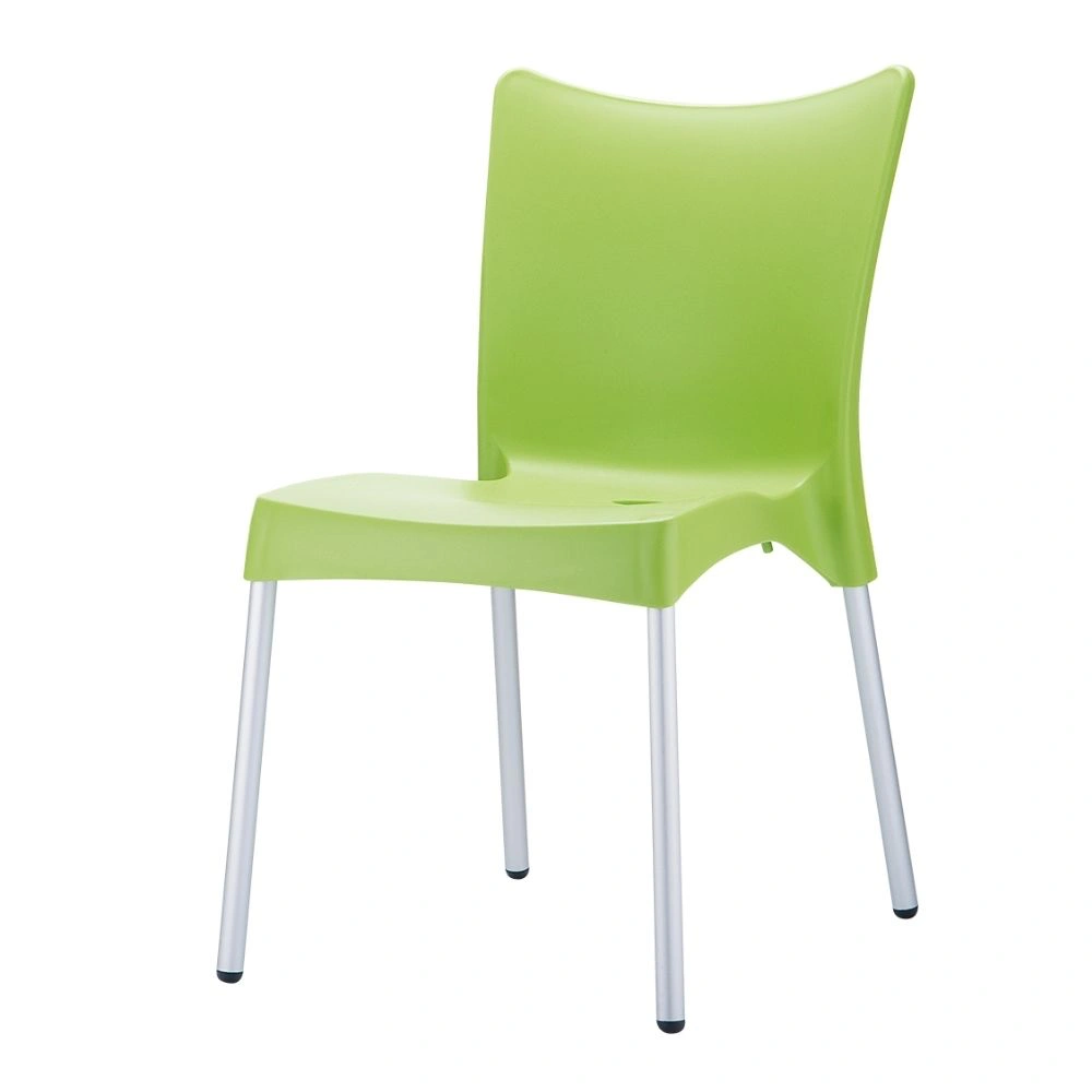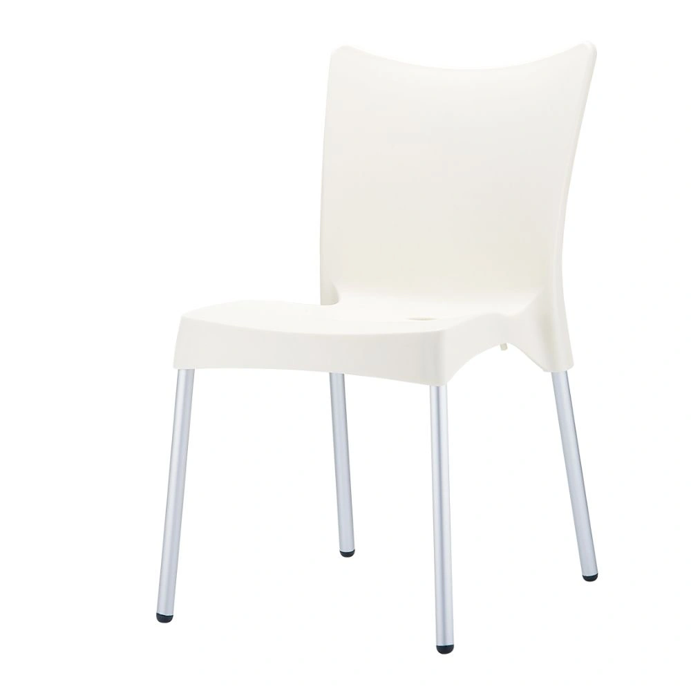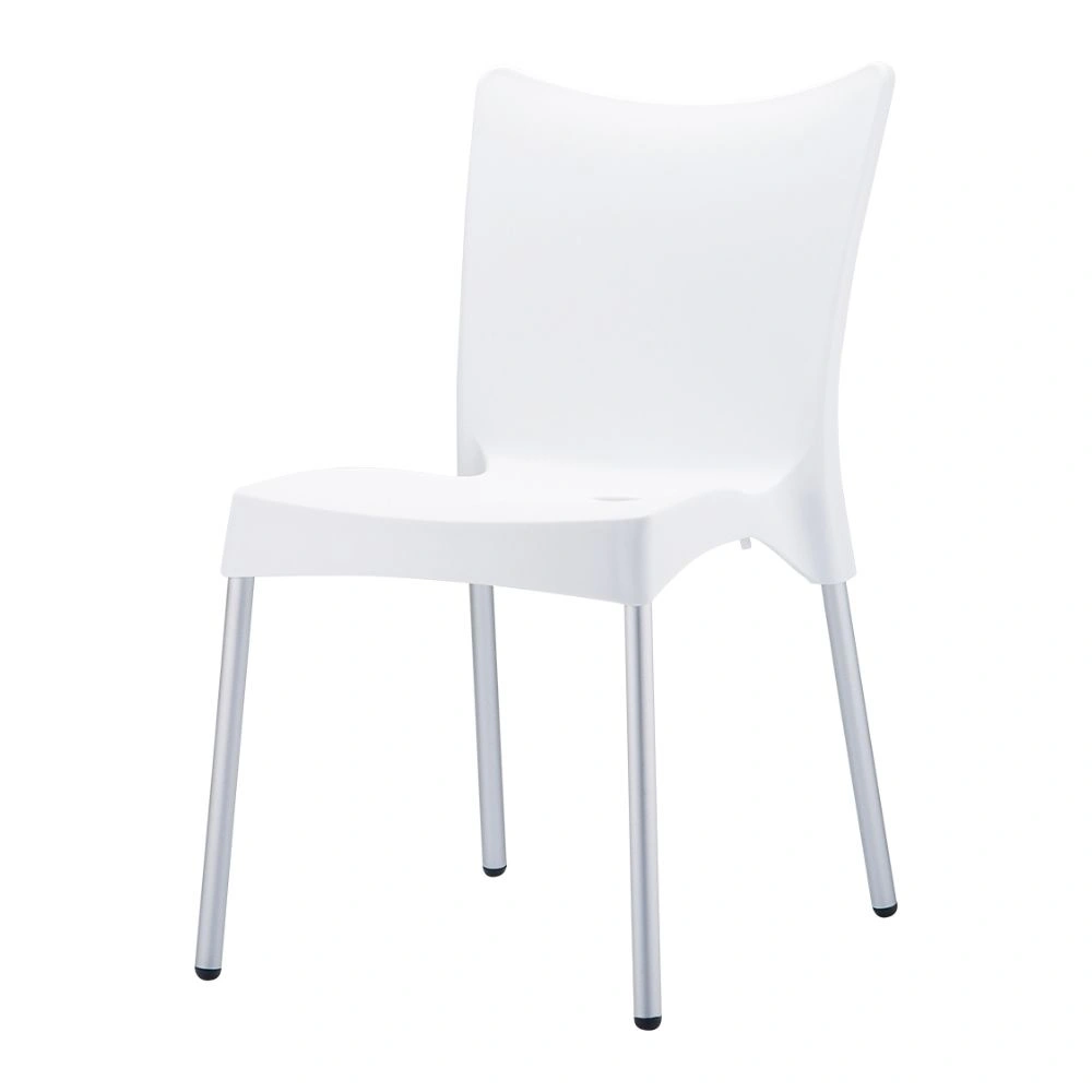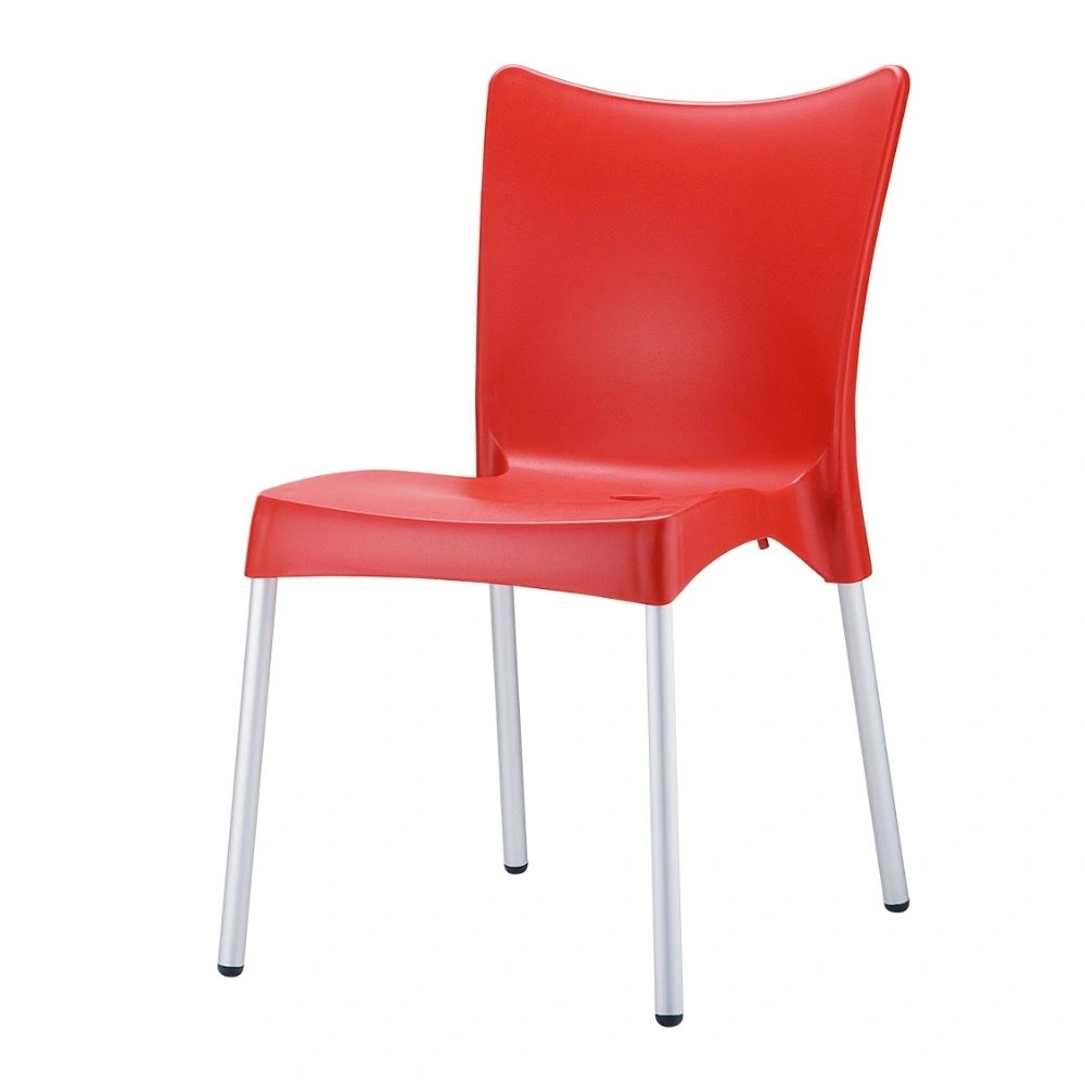 Silla apilable con asiento y respaldo en polipropileno reciclable y patas de aluminio anodizado Ø25 mm. Ligera, resistente y apta para uso en interior y exterior.