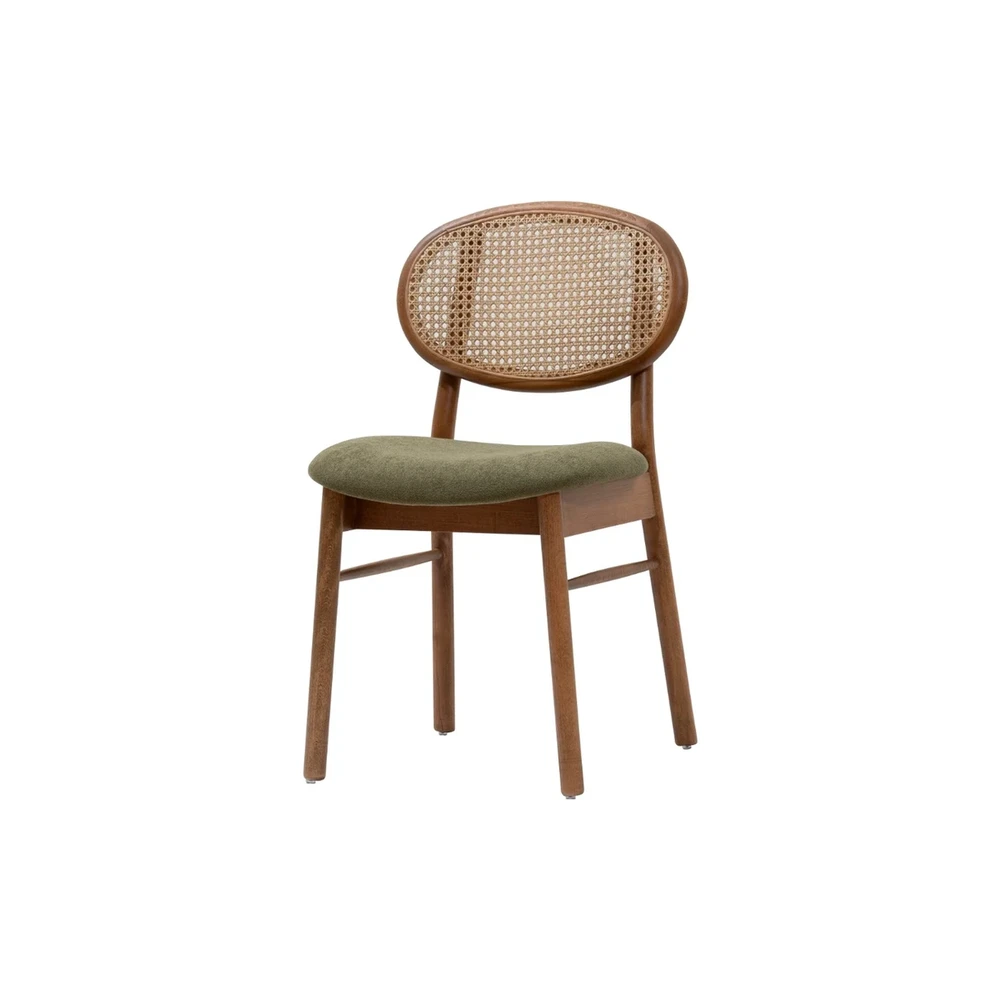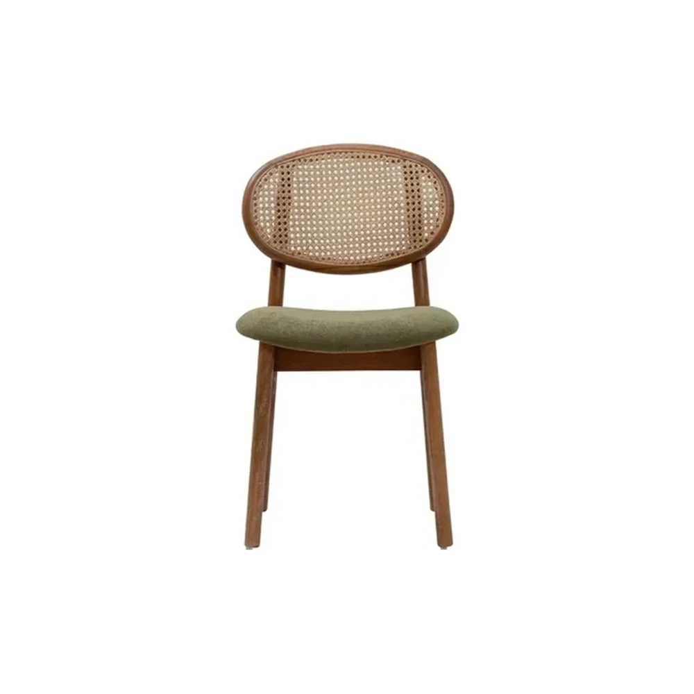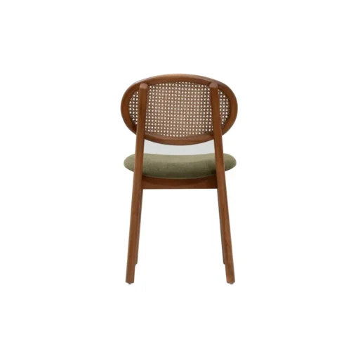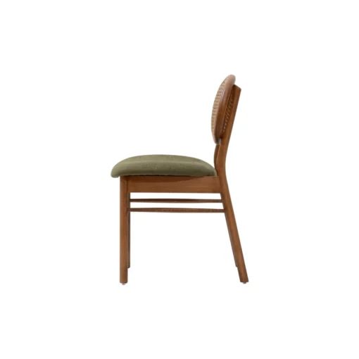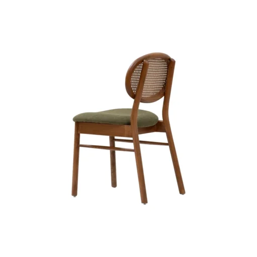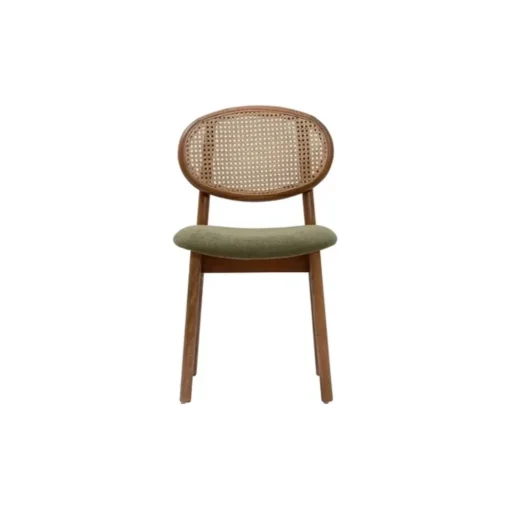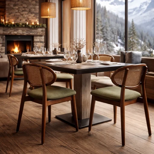 Silla con respaldo en ratán tejido ovalado y tapizado verde oliva es una de las piezas más deseadas para proyectos Horeca en 2026. Combina artesanía natural (ratán en el respaldo), tonos tierra profundos (verde oliva en el asiento) y madera maciza para crear un diseño ligero, ventilado y acogedor que transmite autenticidad, calma y sofisticación orgánica sin esfuerzo.