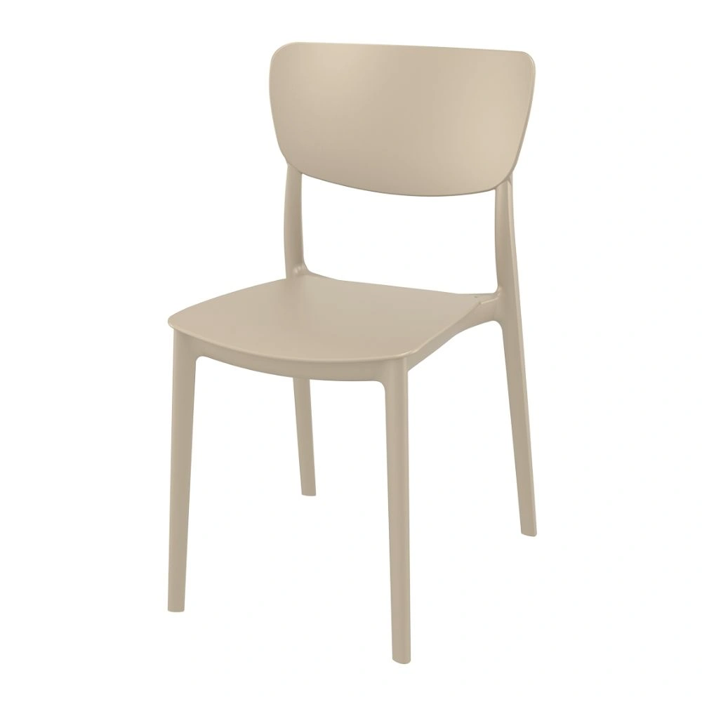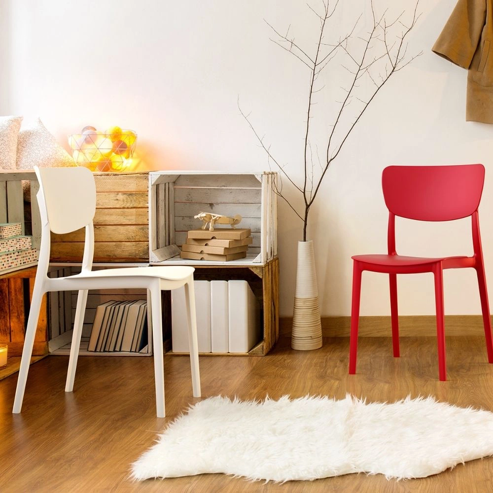 Silla apilable fabricada en polipropileno reforzado con fibra de vidrio mediante inyección. Resistente, ligera y apta para uso intensivo en interior y exterior.