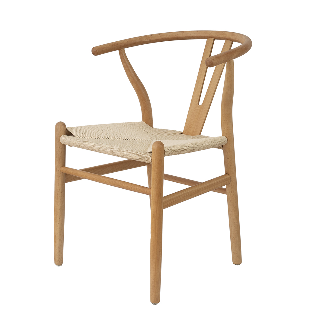 La silla Wish es una fiel réplica del legendario modelo CH24 Wishbone, creado por Hans J. Wegner en 1949 y símbolo del diseño escandinavo. Con estructura de madera maciza de haya en tono natural y asiento trenzado a mano en cuerda, esta pieza aporta ligereza visual y calidez a cualquier ambiente.