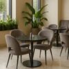 Banqueta con respaldo y asiento tapizados antimanchas de alta calidad. Estructura de metal pintado color negro texturizado al horno.Carcasa interior de madera curvada de haya en respaldo, y asiento en MDF. Se sirve desmontada en caja de 4 unidades. Garantía de nuestros productos 3 años.